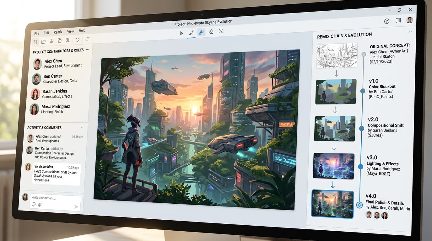 Start the collaboration by posting the first piece with remix enabled. Other collaborators remix it to add their contributions. Each remix automatically credits previous creators, building a visible chain of collaboration.