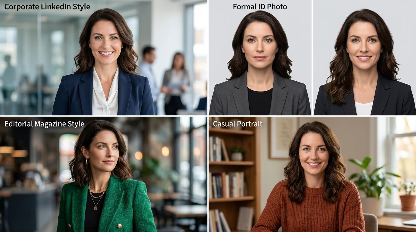 - Casual: Relaxed portrait with natural lighting, softer expression, approachable vibe