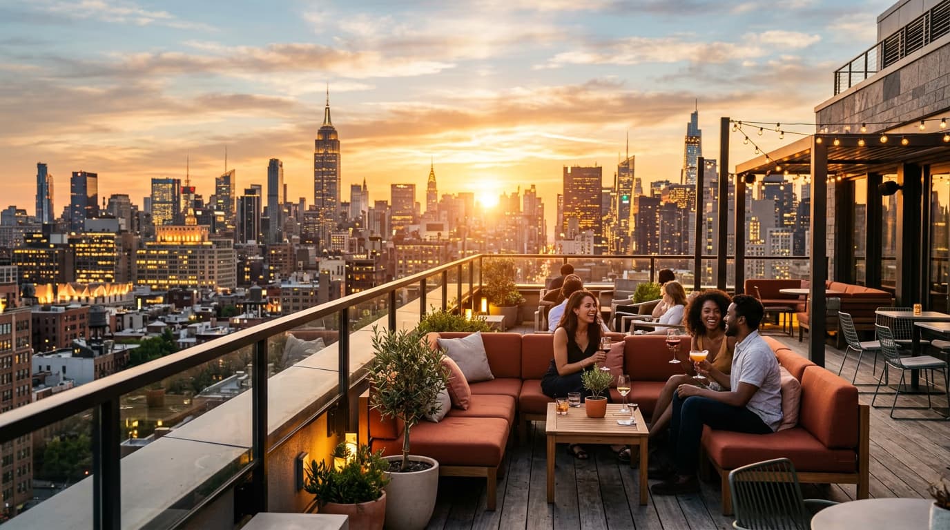 - Urban environments: City rooftop at dusk, brick wall with street lights, modern cafe interior